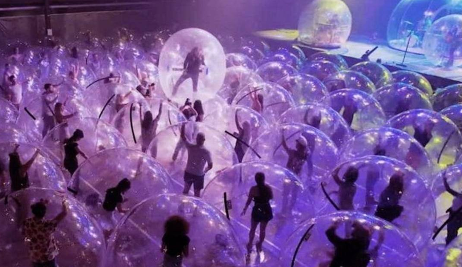 Os músicos e o público foram colocados dentro de bolhas infláveis, mantendo o distanciamento seguro para previnir a transmissão da Covid-19.